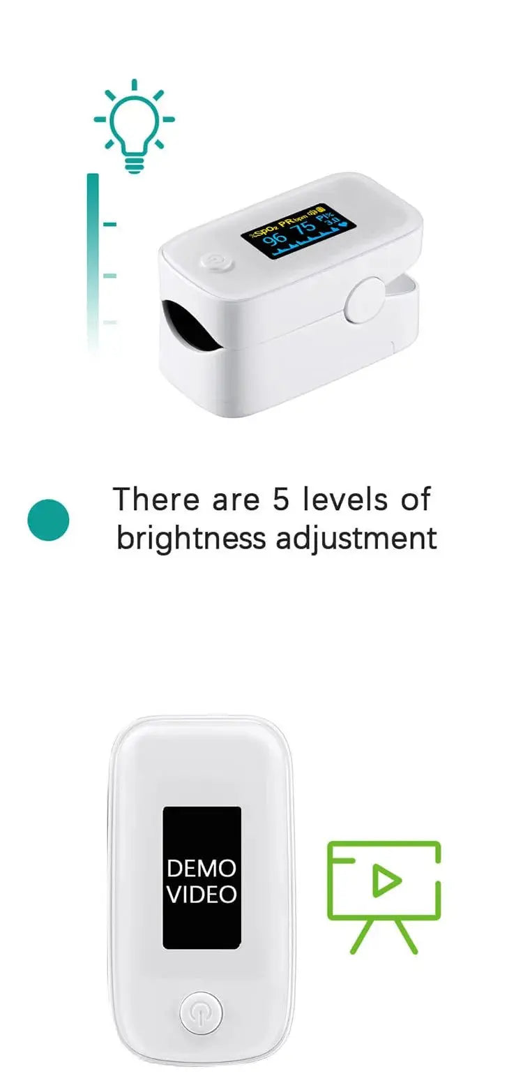 Monitorea tu vitalidad con claridad y confianza: este oxímetro de pulso del dedo, con pantalla OLED de 0.96" que muestra SpO2 (80-100% ±2%), pulso (PR) y bpm, ofrece precisión del 99.9% para chequeos rápidos en casa. Compacto (57x30x31 mm), en material acrílico duradero, alimentado por batería reemplazable (manual), con certificados CE/ISO y norma GB/T18830-2009 para seguridad.